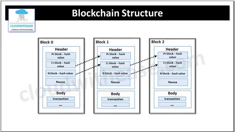 - The header contains hash values of previous and current blocks and nonce. The block data is searched using an index method. Block does not contain hash value of next block but it is added as a practice.