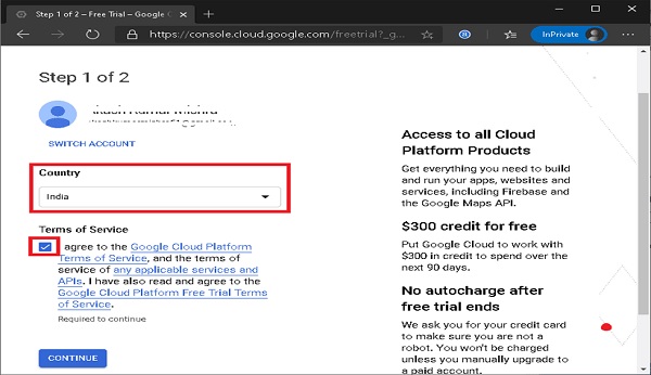 Here, select the Country, agree to the Terms of Service, and then click on the ‘CONTINUE’ button.