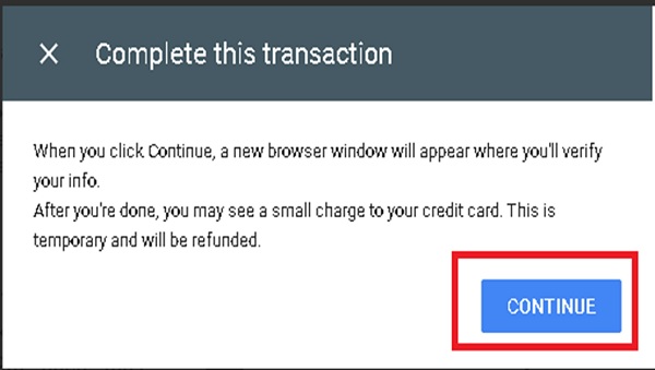Step 6: Google will ask for confirmation to use the credit card by making a small deduction to ensure that the card information is correct. However, the amount is refunded back to the same account. Click on the ‘CONTINUE’ button: