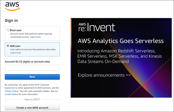 - Sign in to IAM console as account owner by selecting Root user and enter AWS account email address and then enter password.