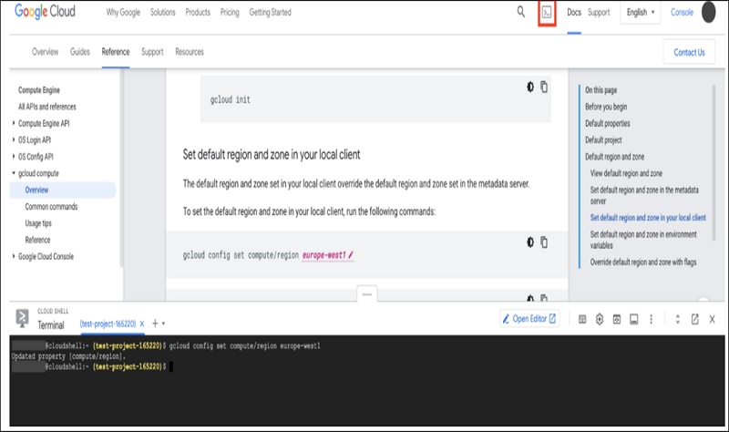 - Launching within documentation – you will find ‘Activate shell’ in the header of the documentation page . This will launch a cloud shell as a panel in the current page at the bottom. The cloud shell terminal comes with Cloud SDK, Docker, Terraform, and command line utilities as pre-installed and authentication is based on your google credentials.
